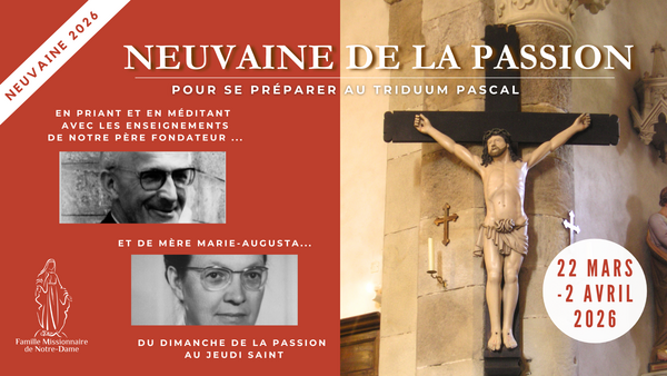 Ces deux dates "liturgiques" correspondent à des faits marquants pour notre Famille religieuse : en effet, notre Père fondateur, le Père Lucien-Marie est décédé le "Dimanche de la Passion" (5ème dimanche de Carême) 2 avril 2006, tandis que Mère Marie-Augusta, le "fondement" de notre famille religieuse, est décédée le Jeudi Saint 11 avril 1963. C'est ainsi qu'ils ont établi pour toujours, pour nous, une "neuvaine" qui nous prépare à bien vivre les jours saints.