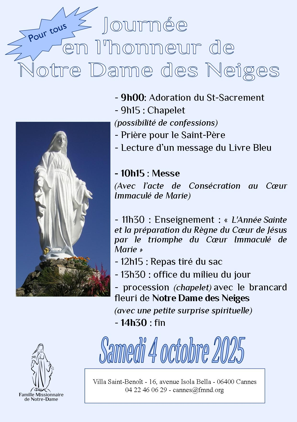 journée en l'honneur de Notre-Dame des Neiges et 1er samedi du mois à Cannes le 4 octobre 2025
