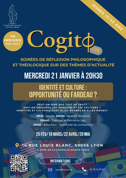 Cogito est un groupe de réflexion philosophique pour les jeunes, de tous horizons, un mercredi par mois. Dans notre foyer de Lyon, à partir de 20h00