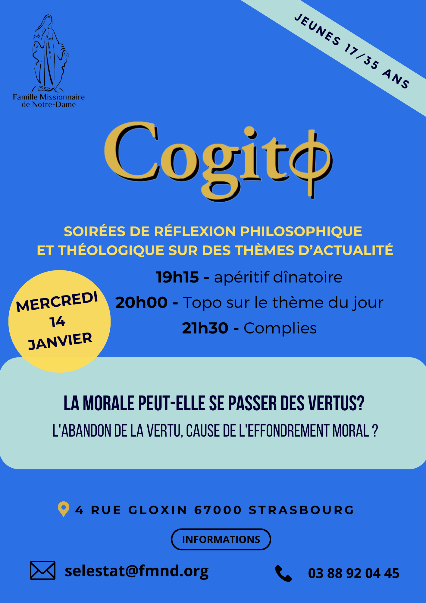 Rendez-vous à au foyer paroissial, 4 rue Gloxin, Strasbourg, à 19h15 pour un apéritif dînatoire, suivi à 20h00 d'un topo avec un temps de réflexion et de partage sur le thème du jour :